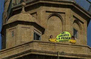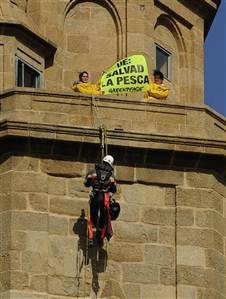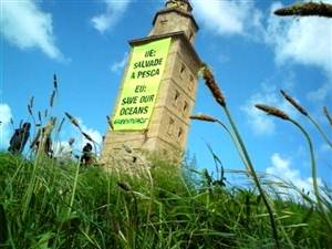 10:30: Comienza la acción de Greenpeace en la Torre de Hércules en A Coruña para pedir a la Unión Europea, cuyos líderes están reunidos en Vigo, que salven las pesquerías.