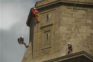 11:30 Ya son cuatro los escaladores que están bajando la pancarta descolgándose con las cuerdas.