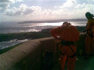 11:40 Los periodistas están en tensa espera. El viento es muy fuerte, las olas rompen con fuerza. Los escaladores siguen intentando desplegar.