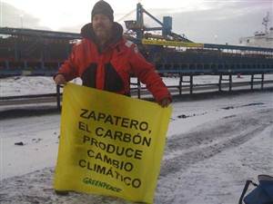 - 8.00 h.- Un escalador de Greenpeace trepa encima de una grúa, bloqueando la carga de un barco de carbón.