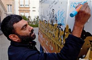 | Kumi Naidoo, director de Greenpeace Internacional, junto al camión anti-transgénicos |