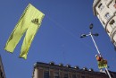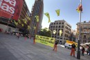 Activistas de Greenpeace cuelgan los "trapos sucios" de Nike y Adidas en la plaza de Callao de Madrid