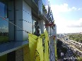 Escaladores de Greenpeace despliegan una pancarta de 90 metros cuadrados en el edificio Vincci Capitol de Callao con las “fotos de boda” de Rajoy, Aznar y González y sus parejas de las compañías eléctricas. La organización denuncia el “matrimonio...